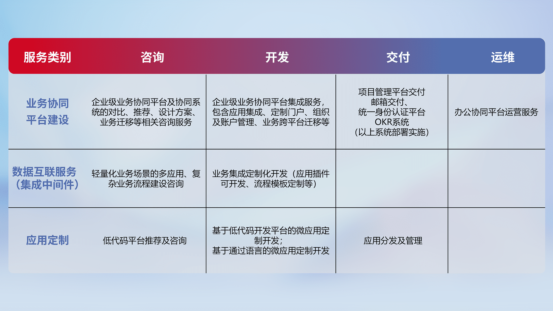 针对钉钉、、、企微、、IDaas等平台级产品提供产品的规划、、、方案、、交付、、、定制化开发等服务,,,,实现如统一协同办公、、、、智能客户服务、、混合会议管理、、、、智能数据查询、、等业务场景,,实现数字化转型。。。。