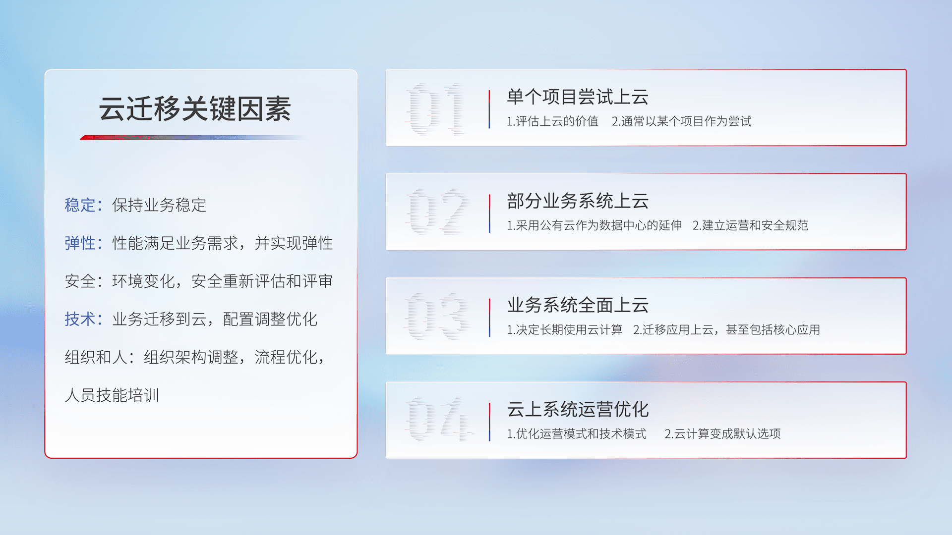 结合实际业务,,,从规划设计、、、云平台选型、、云原生改造、、数据迁移、、、集成交付,,,迁移全过程为客户识别最佳上云路径,,,,做好风险识别管理,,,设计网络架构、、、、身份权限、、、安全审计合规、、、操作审计、、日志审计、、监控告警策略、、、、多站点容灾设计等,,,对云上基础设施进行整体规划,,,,提升IT治理水平,,以满足弹性、、、、高可用、、、、高性能的需求。。。。